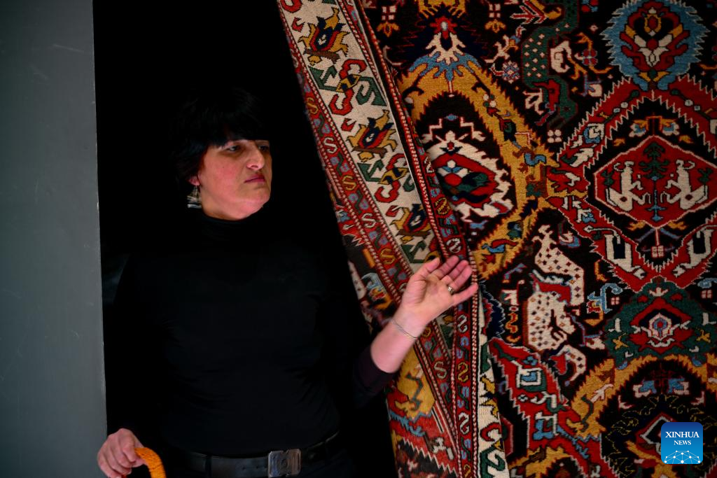 A woman showcases a carpet product at the International Carpet Festival held in Baku, Azerbaijan, on May 3, 2025. (Photo by Tofik Babayev/Xinhua)