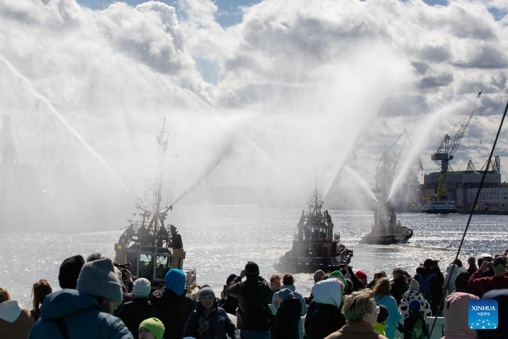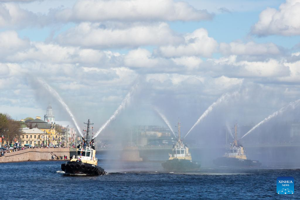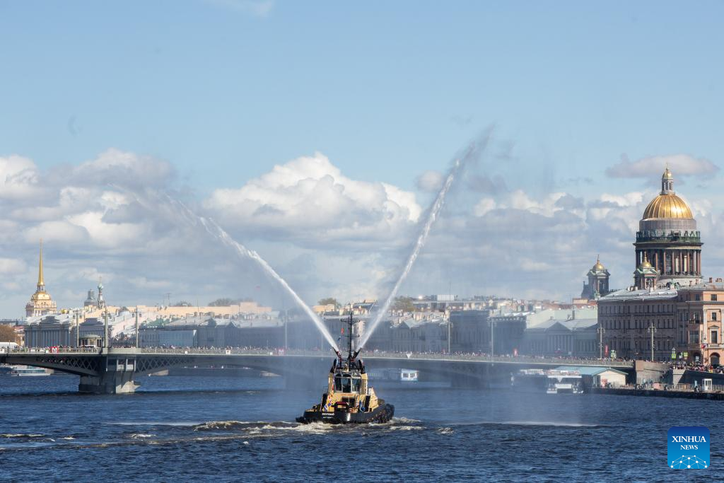 A tugboat performs with its water cannons in Neva River during the Icebreakers Festival in St. Petersburg, Russia, May 3, 2025. The traditional Icebreakers Festival was held here from May 1 to May 4, officially kicking off this year's tourism season. (Photo by Irina Motina/Xinhua)