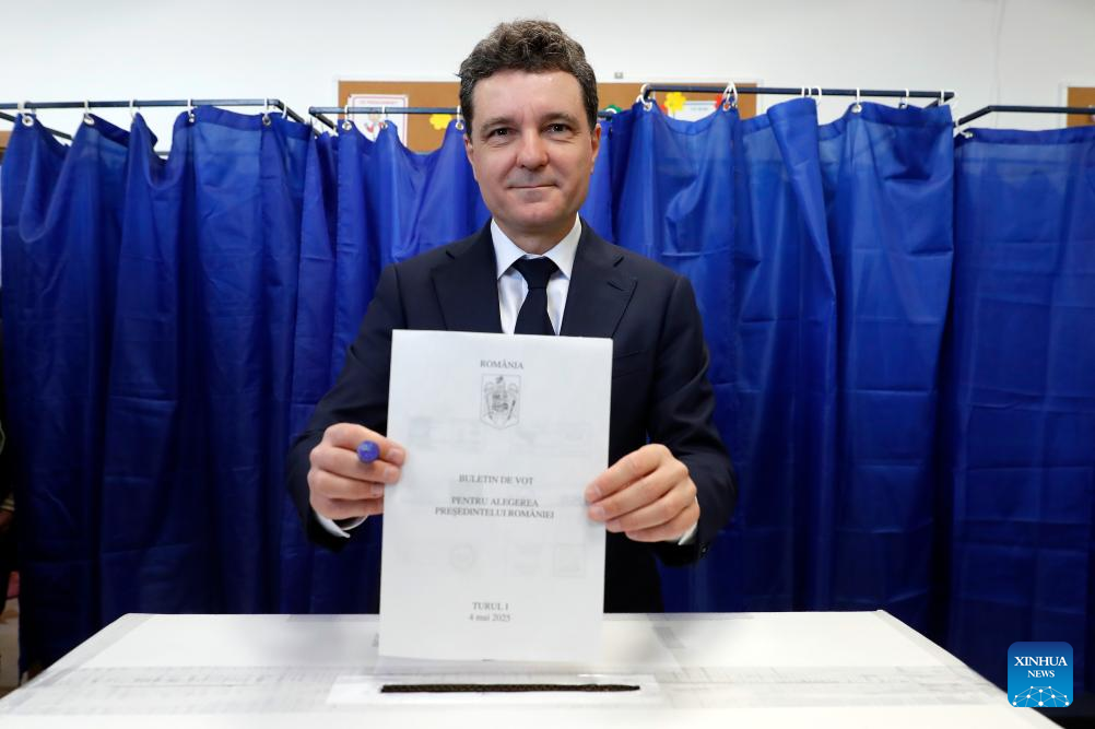 Mayor of Bucharest Nicusor Dan talks to the media after casting his ballot during the first round of the presidential election rerun at a polling station in Bucharest, Romania, May 4, 2025. Romanians headed to the polls on Sunday for the first round of the presidential election rerun contested by 11 candidates. According to the Permanent Electoral Authority of Romania, over 18 million registered voters are expected to cast their ballots at around 19,000 polling stations, including over 960 abroad, from 7 a.m. to 9 p.m. local time (0400 to 1800 GMT). (Photo by Cristian Cristel/Xinhua)