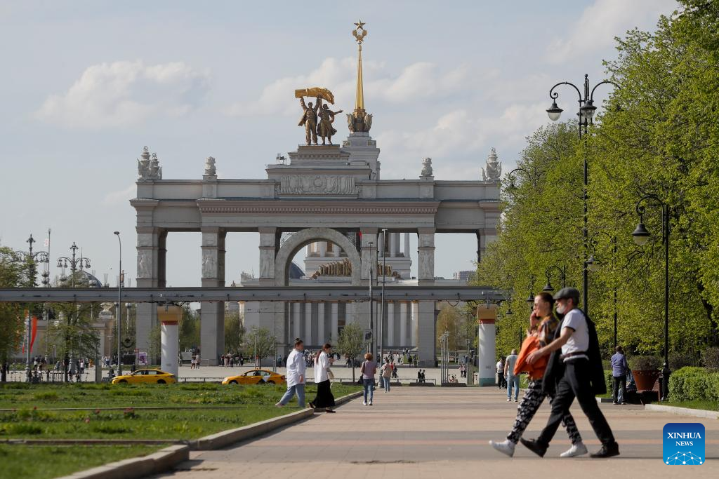 People walk past the Exhibition of Achievements of National Economy in Moscow, Russia, April 22, 2025. (Photo by Alexander Zemlianichenko Jr/Xinhua)