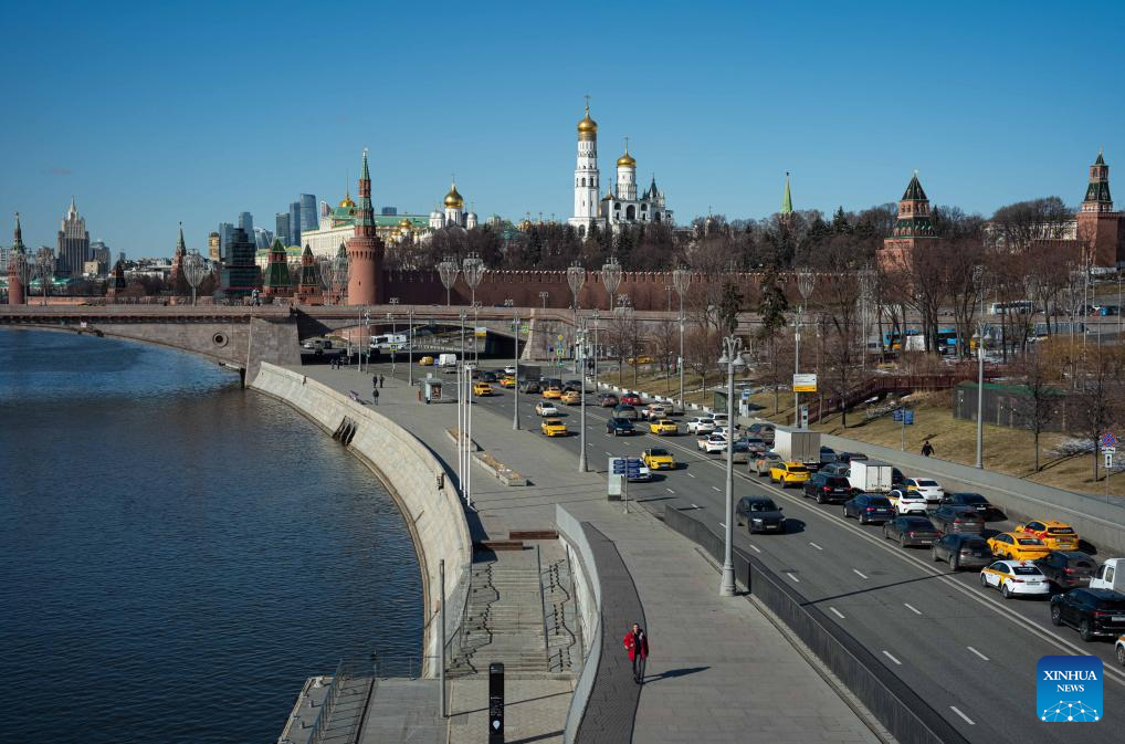 People walk by the Moscow River in Moscow, Russia, March 18, 2025. (Xinhua/Bai Xueqi)