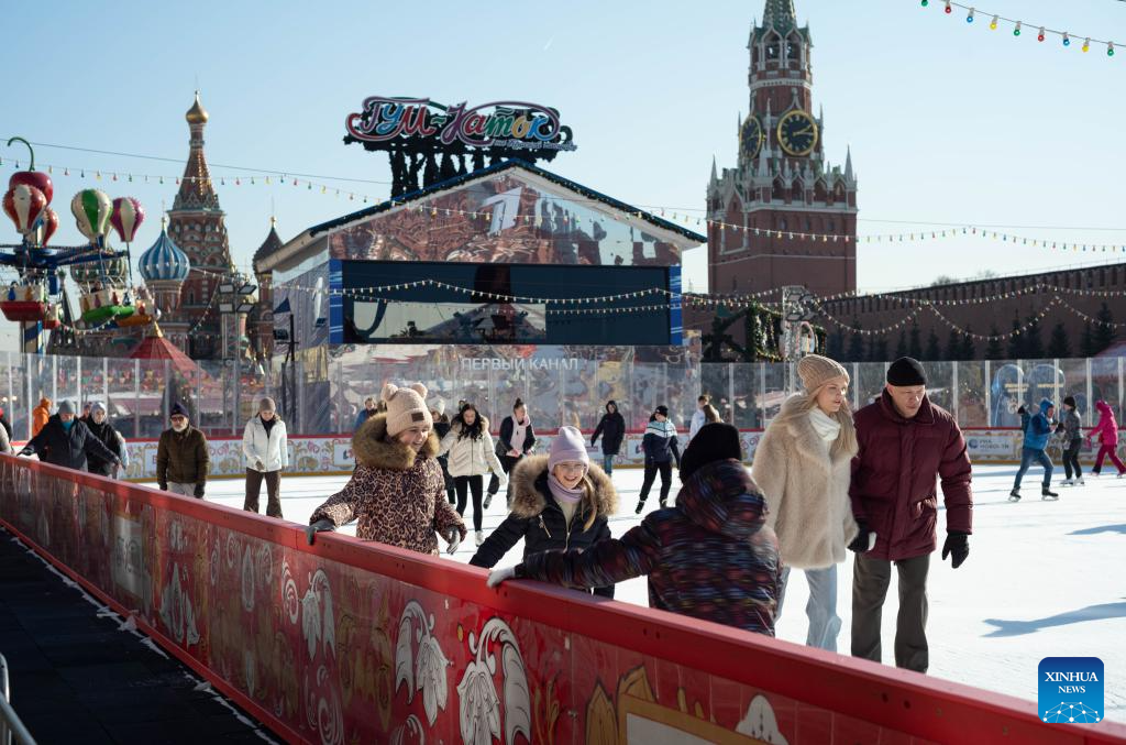 People skate in an ice rink at the Red Square in Moscow, Russia, Feb. 25, 2025. (Xinhua/Bai Xueqi)