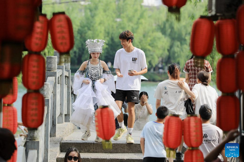 People visit an ancient town in Qiandongnan Miao and Dong Autonomous Prefecture, southwest China's Guizhou Province, May 3, 2025. People across China enjoy the ongoing May Day holiday in various ways. (Photo by Tai Shengzhi/Xinhua)