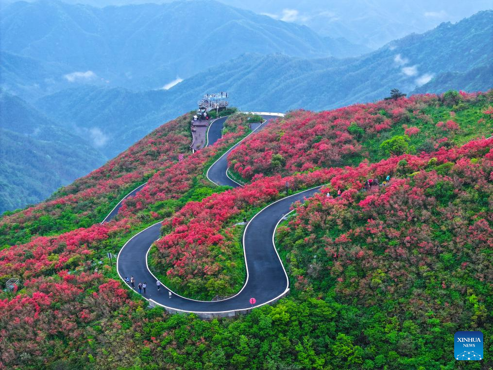 An aerial drone photo taken on May 3, 2025 shows tourists viewing azalea flowers in Yongzhou, central China's Hunan Province. People across China enjoy the ongoing May Day holiday in various ways. (Photo by Zhou Xiuyuchun/Xinhua)