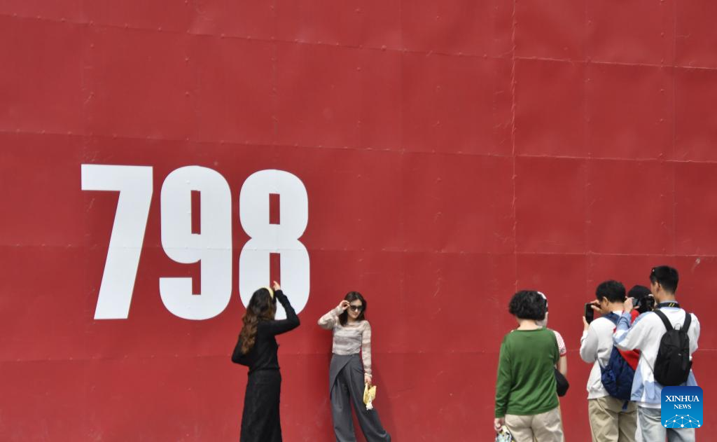 People pose for a photo at the 798 art zone in Beijing, capital of China, May 4, 2025. People across China enjoy the ongoing May Day holiday in various ways. (Xinhua/Li Xin)