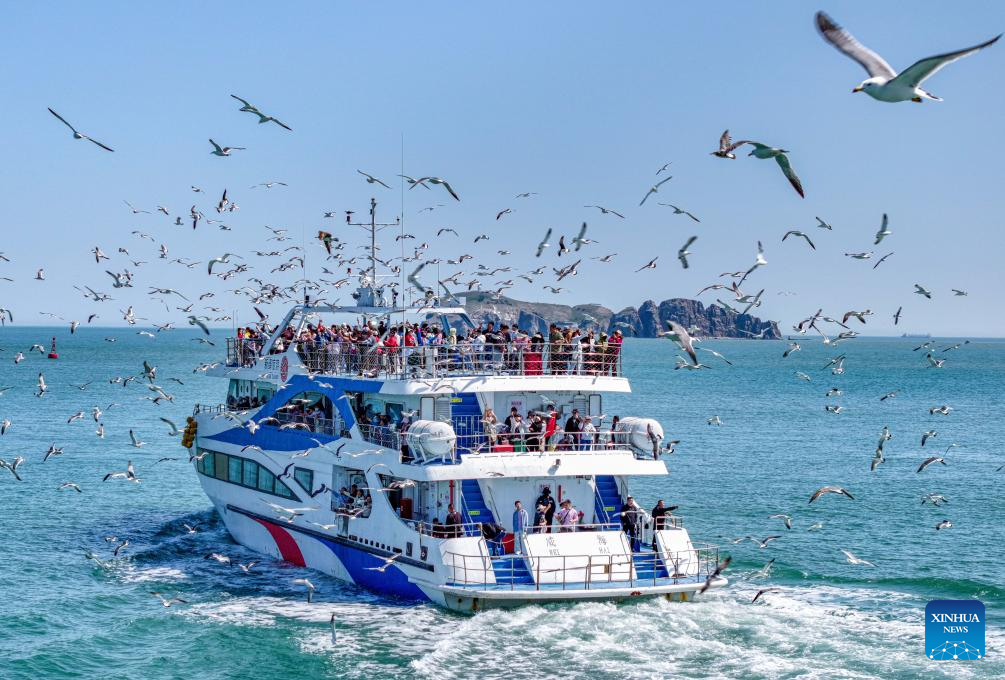 This aerial drone photo taken on May 4, 2025 shows tourists enjoy a boat tour in Rongcheng City, east China's Shandong Province. People across China enjoy the ongoing May Day holiday in various ways. (Photo by Li Xinjun/Xinhua)