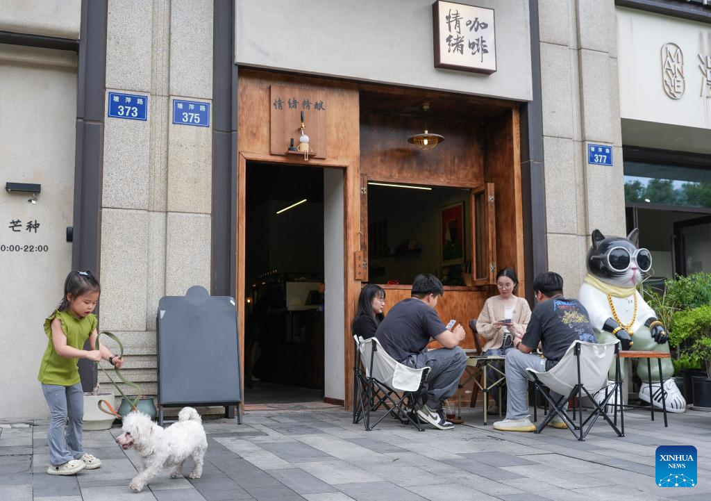 People enjoy their leisure time in front of a cafe in Hangzhou, east China's Zhejiang Province, May 4, 2025. People across China enjoy the ongoing May Day holiday in various ways. (Xinhua/Huang Zongzhi)