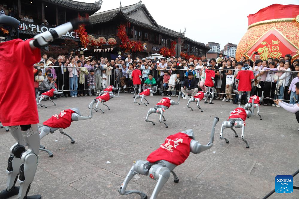 Tourists watch a robot show at Taizhou City, east China's Zhejiang Province, May 4, 2025. People across China enjoy the ongoing May Day holiday in various ways. (Photo by Jiang Youqing/Xinhua)