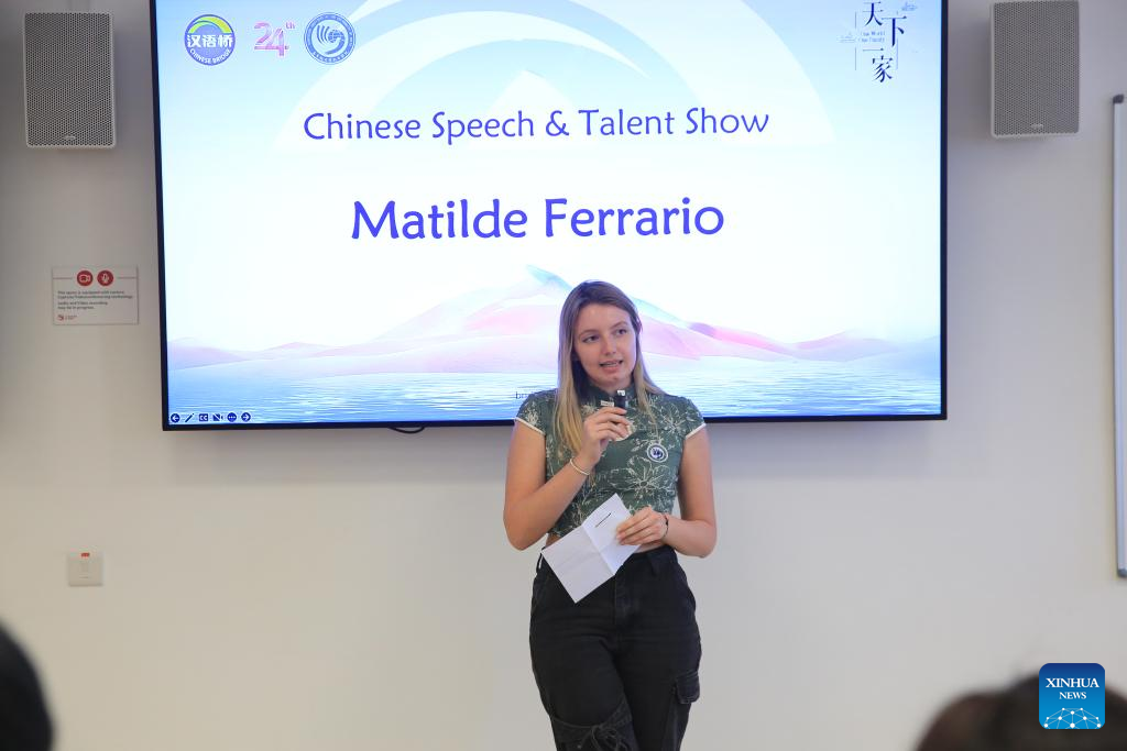 A student gives a speech during the Maltese leg of the 24th "Chinese Bridge" Chinese proficiency competition for foreign university students at the University of Malta in Msida, Malta, on May 7, 2025. Six students from the University of Malta showcased their Chinese language skills and talents on Wednesday during the Maltese leg of the 24th "Chinese Bridge" Chinese proficiency competition for foreign university students. (Xinhua/Chen Wenxian)