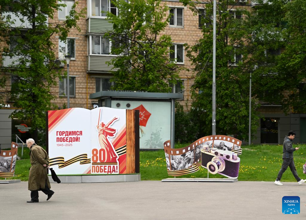 Victory Day decorations are pictured in Moscow, Russia, May 6, 2025. (Xinhua/Zhang Ling)