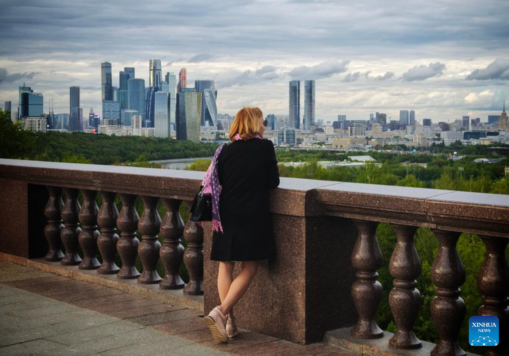 A woman looks out from the observation platform of Sparrow Hills in Moscow, Russia, May 5, 2025. (Xinhua/Wang Ye)