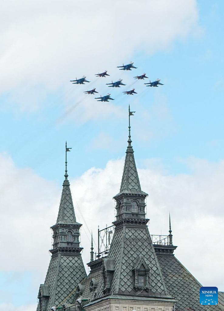 Aircraft fly in formation during a grand parade marking the 80th anniversary of the victory in the Soviet Union's Great Patriotic War in Moscow, Russia, May 9, 2025. (Xinhua/Zhang Ling)