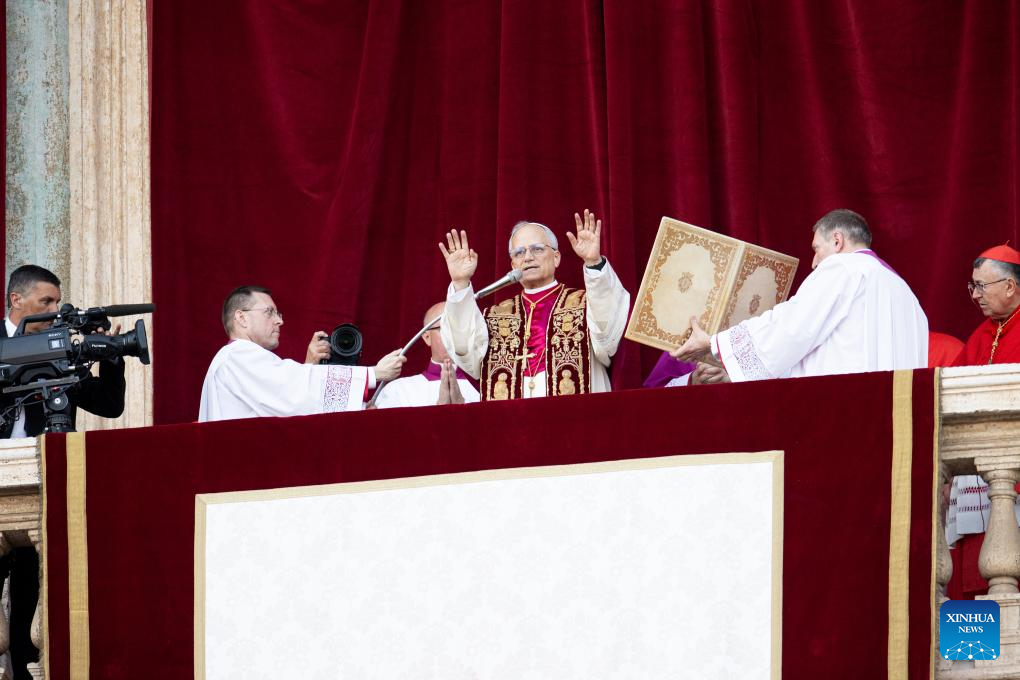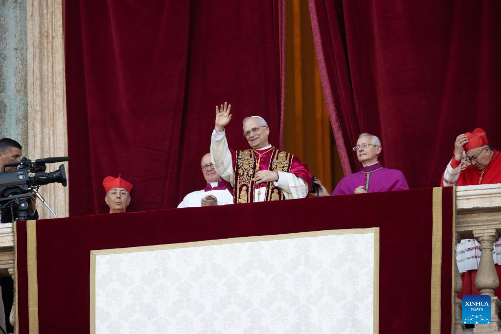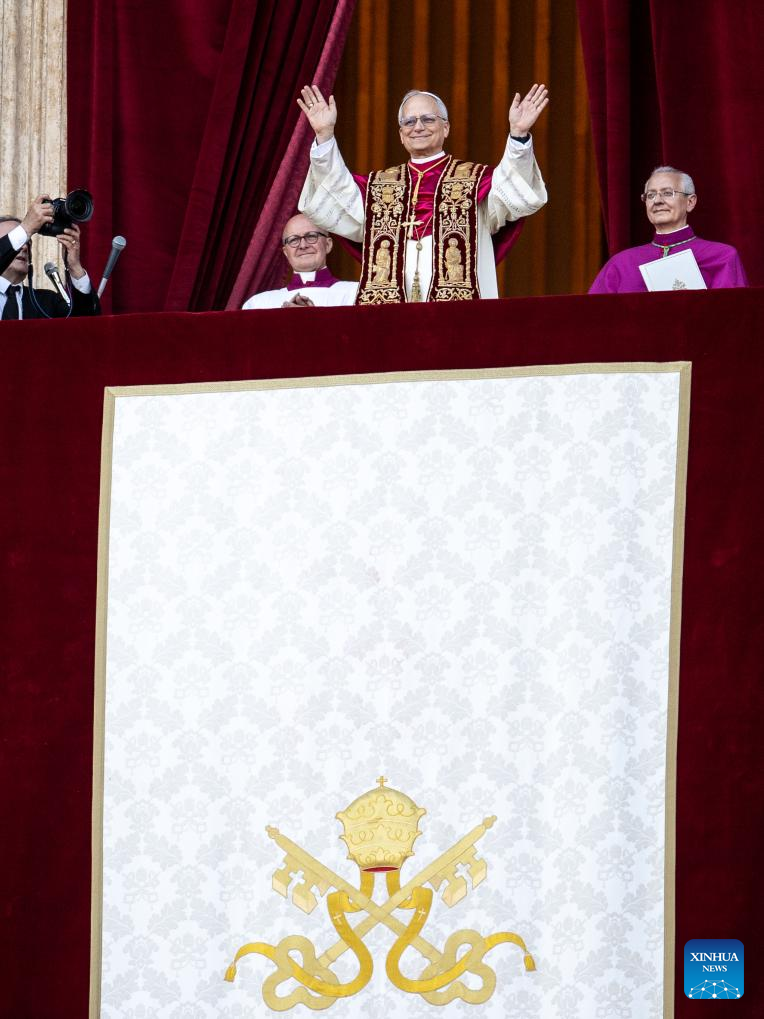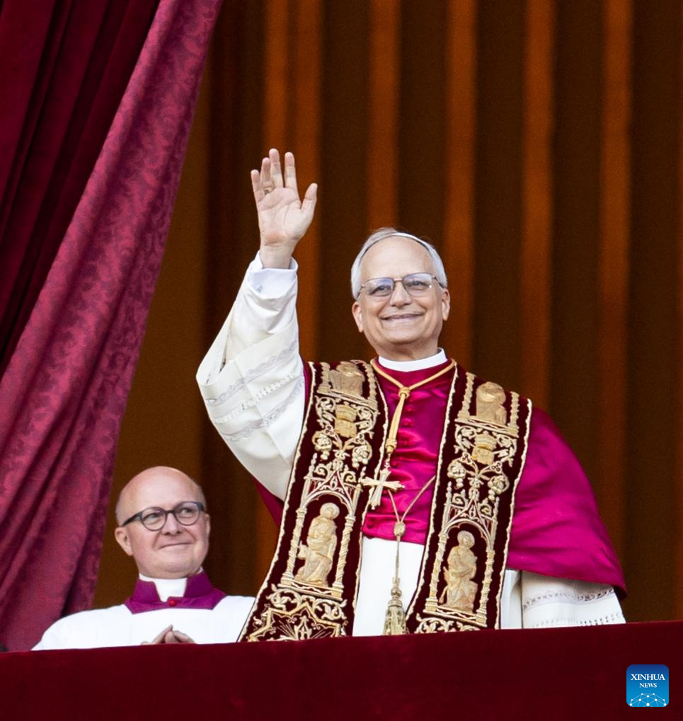 Robert Francis Prevost waves to the crowd after being elected the new pope in Vatican City, on May 8, 2025. Robert Francis Prevost, the cardinal of the United States, was elected the new pope on the second day of secret ballots in the cardinals' conclave held in Vatican City. The name he chose as the new pope was Leo XIV. (Xinhua/Li Jing)