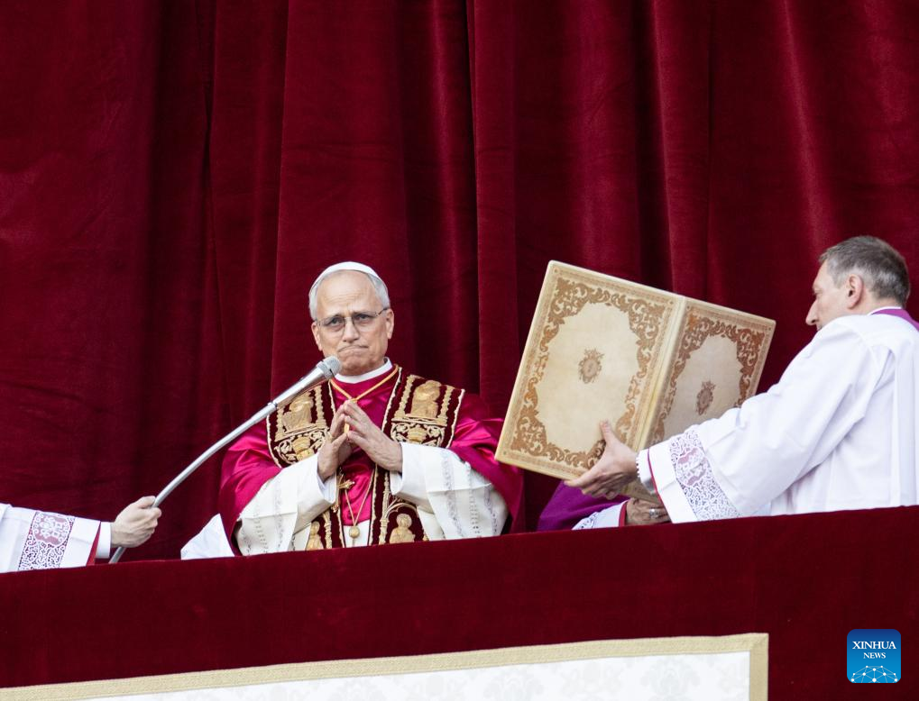 Robert Francis Prevost (L) addresses the crowd after being elected the new pope in Vatican City, on May 8, 2025. Robert Francis Prevost, the cardinal of the United States, was elected the new pope on the second day of secret ballots in the cardinals' conclave held in Vatican City. The name he chose as the new pope was Leo XIV. (Xinhua/Li Jing)