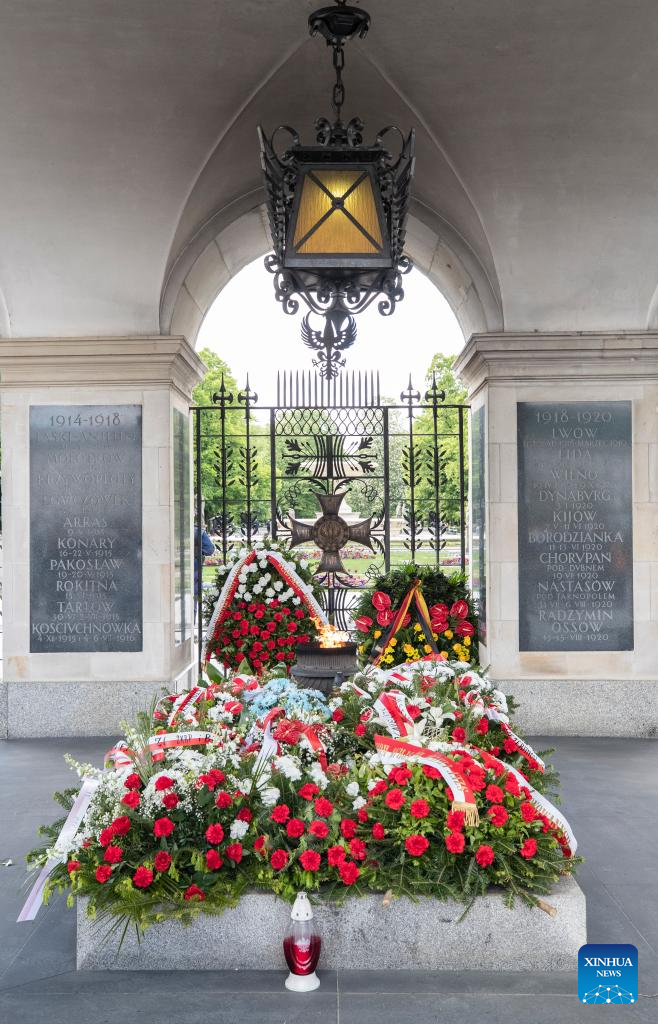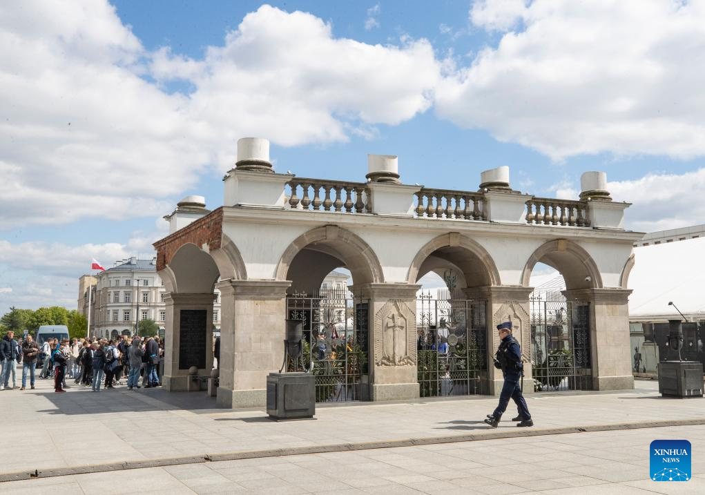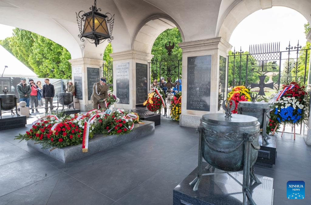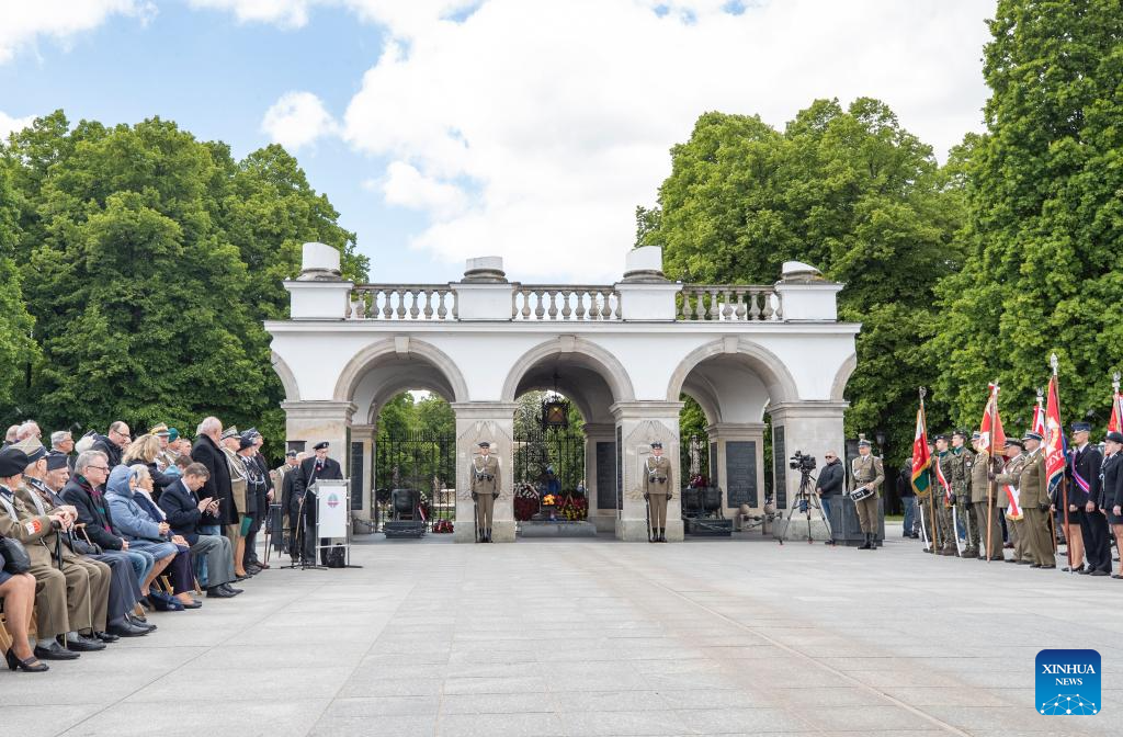 A ceremony commemorating the 80th anniversary of the end of World War II in Europe, known as Victory in Europe Day, is held at the Tomb of the Unknown Soldier in Warsaw, Poland, on May 8, 2025. (Xinhua/Zhang Fan)