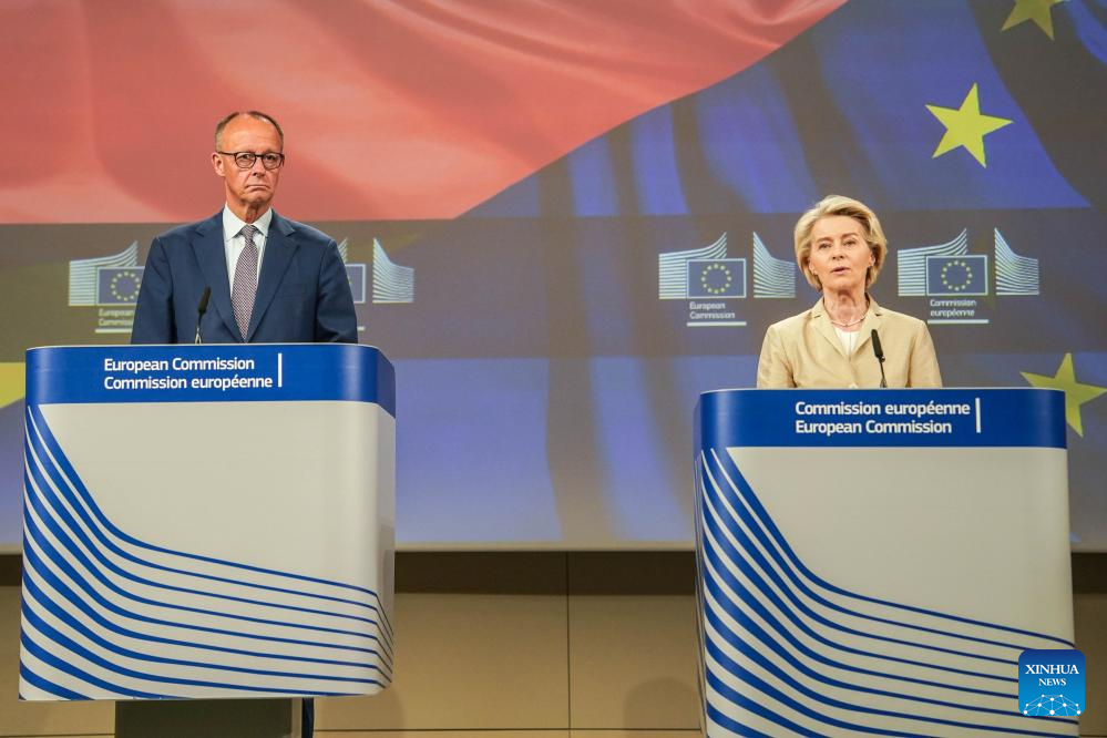 German Chancellor Friedrich Merz (L) and European Commission President Ursula von der Leyen attend a press conference together in Brussels, Belgium, May 9, 2025. Merz arrived here for a visit on Friday. (Xinhua/Peng Ziyang)