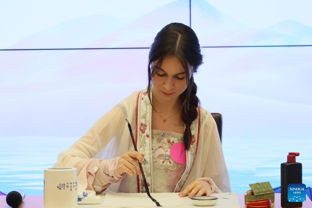 A competitor writes calligraphy during the 24th "Chinese Bridge" Chinese Proficiency Competition for College Students in Cluj-Napoca, Romania, May 10, 2025. The Romanian division finals of the 24th "Chinese Bridge" Chinese Proficiency Competition for College Students was held here on Saturday. (Photo by Lu Jicheng/Xinhua)