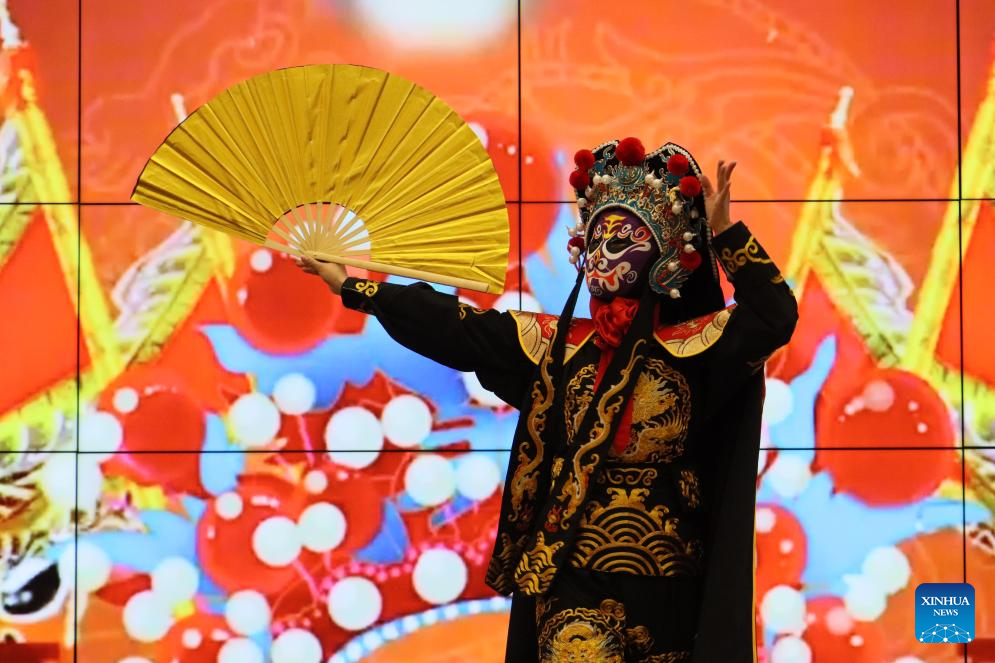A volunteer teacher of Confucius Institute performs Bianlian, or face-changing, a part of the Sichuan opera, during the 24th "Chinese Bridge" Chinese Proficiency Competition for College Students in Cluj-Napoca, Romania, May 10, 2025. The Romanian division finals of the 24th "Chinese Bridge" Chinese Proficiency Competition for College Students was held here on Saturday. (Photo by Lu Jicheng/Xinhua)