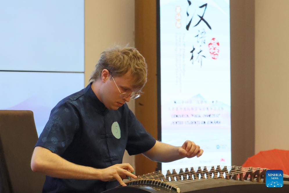 A competitor performs during the 24th "Chinese Bridge" Chinese Proficiency Competition for College Students in Cluj-Napoca, Romania, May 10, 2025. The Romanian division finals of the 24th "Chinese Bridge" Chinese Proficiency Competition for College Students was held here on Saturday. (Photo by Lu Jicheng/Xinhua)