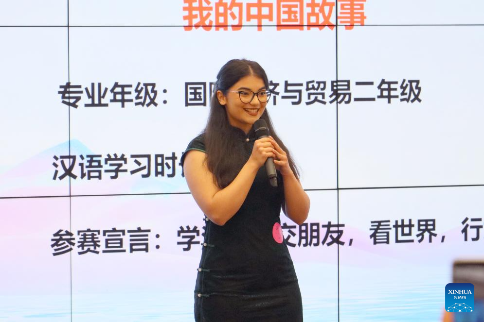 A competitor delivers a speech during the 24th "Chinese Bridge" Chinese Proficiency Competition for College Students in Cluj-Napoca, Romania, May 10, 2025. The Romanian division finals of the 24th "Chinese Bridge" Chinese Proficiency Competition for College Students was held here on Saturday. (Photo by Lu Jicheng/Xinhua)