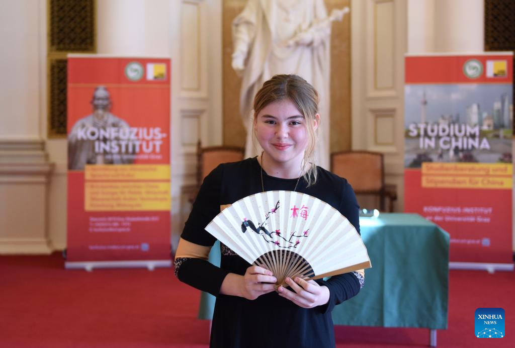 A contestant displays her painting during the 24th "Chinese Bridge" Chinese Proficiency Competition for College Students in Graz, Austria, May 10, 2025. The Austrian division finals of the 24th "Chinese Bridge" Chinese Proficiency Competition for College Students was held on Saturday in Graz. (Xinhua/He Canling)