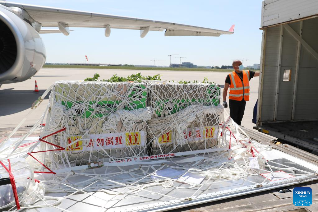 An aircraft carrying three rare Chinese golden snub-nosed monkeys arrives at Brussels airport in Brussels, Belgium, May 14, 2025. Three rare Chinese golden snub-nosed monkeys arrived at the zoo on Wednesday under a 10-year lease agreement.