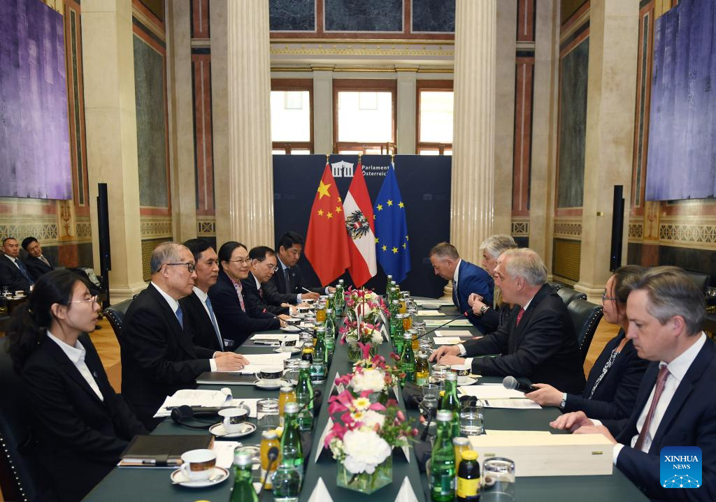 Li Hongzhong, member of the Political Bureau of the Communist Party of China (CPC) Central Committee and vice chairman of the National People's Congress (NPC) Standing Committee, holds talks with the President of the National Council of Austria Walter Rosenkranz in Vienna, Austria, on May 14, 2025. A Chinese delegation led by Li Hongzhong, vice chairman of the National People's Congress (NPC) Standing Committee, visited Austria from Sunday to Wednesday. (Xinhua/He Canling)