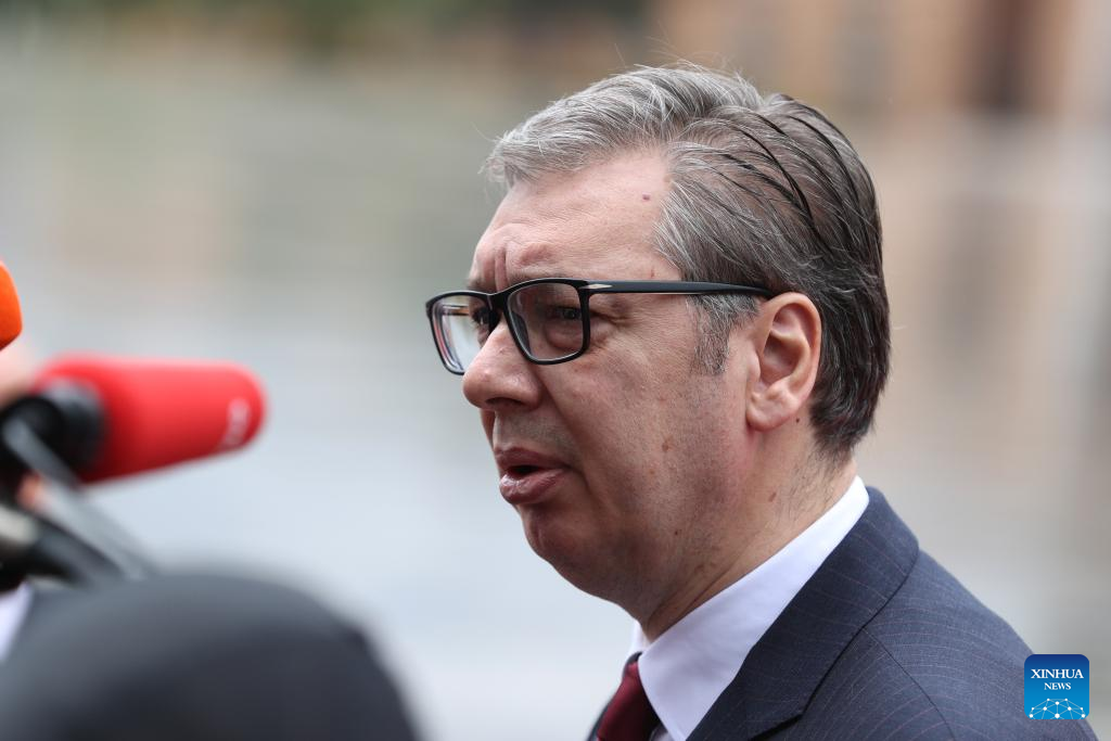 Serbian President Aleksandar Vucic speaks to media during the 6th European Political Community (EPC) Summit in Tirana, Albania, May 16, 2025. (Xinhua/Zhao Dingzhe)