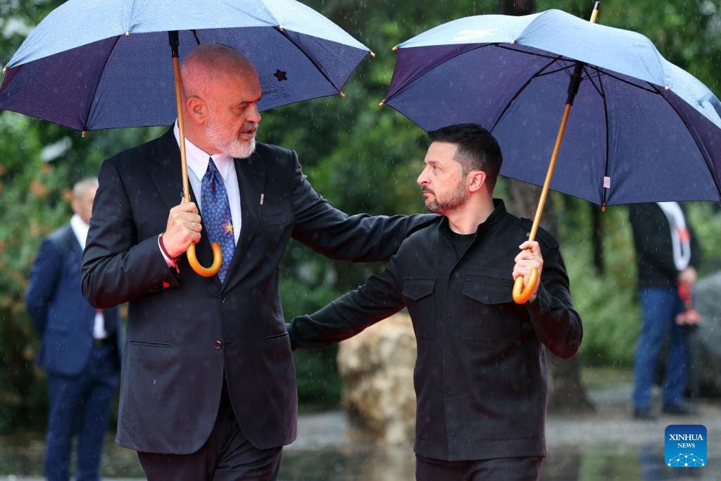 Albanian Prime Minister Edi Rama (L) talks with Ukrainian President Volodymyr Zelensky during the 6th European Political Community (EPC) Summit in Tirana, Albania, May 16, 2025. (Xinhua/Zhao Dingzhe)