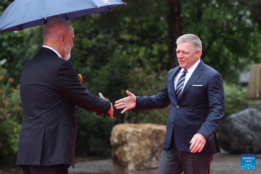 Albanian Prime Minister Edi Rama (L) welcomes Slovak Prime Minister Robert Fico during the 6th European Political Community (EPC) Summit in Tirana, Albania, May 16, 2025. (Xinhua/Zhao Dingzhe)