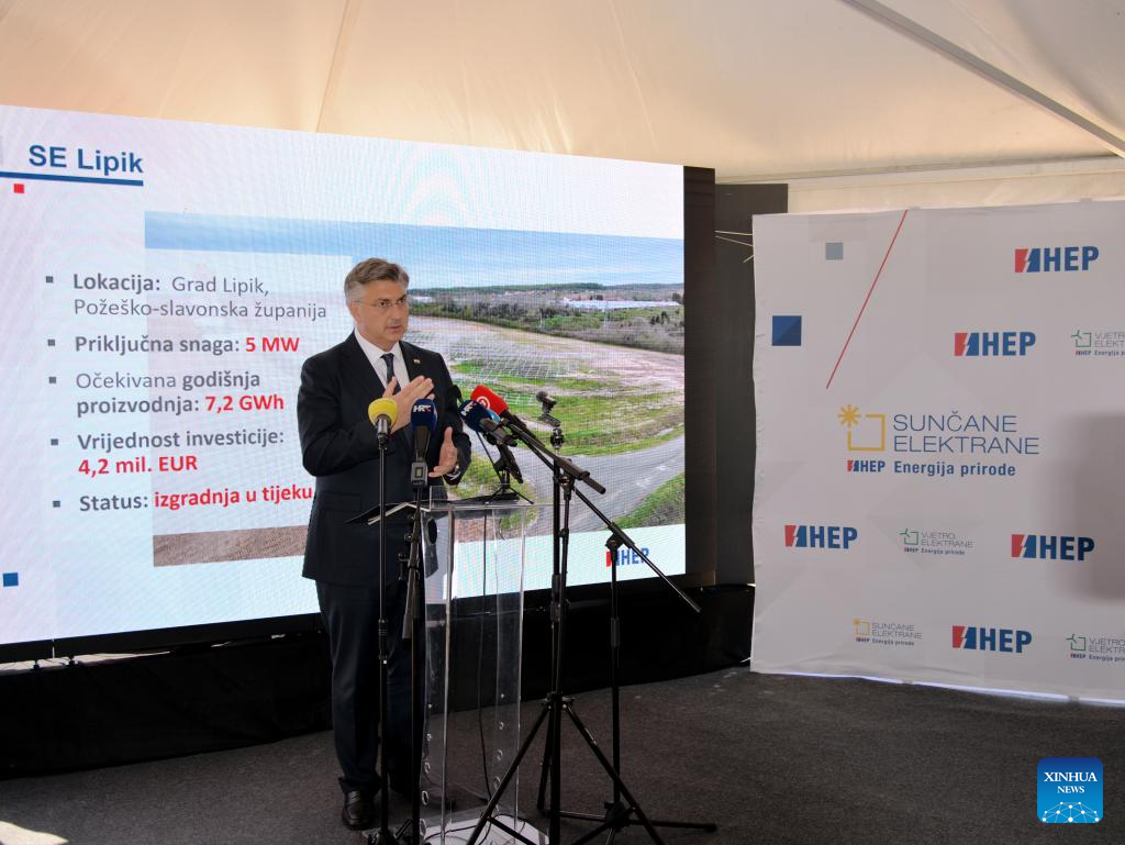Croatian Prime Minister Andrej Plenkovic addresses a groundbreaking ceremony of the Korlat solar project in Korlat, Croatia, on May 15, 2025. The groundbreaking ceremony for Croatia's largest photovoltaic power project, to be constructed by Chinese companies, was held Thursday in Korlat. Croatian Prime Minister Andrej Plenkovic expressed hope that the Korlat solar project would further deepen cooperation and enhance ties between the two countries. (Xinhua/Li Xuejun)