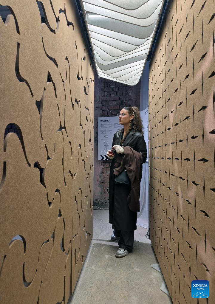 A woman visits the opening exhibition of Romanian Design Week (RDW) 2025 in Bucharest, Romania, May 16, 2025. The event, an annual festival dedicated to architecture, design and creativity, takes place from May 16 to 25 under the theme "Design of Tomorrow, Today." (Photo by Cristian Cristel/Xinhua)