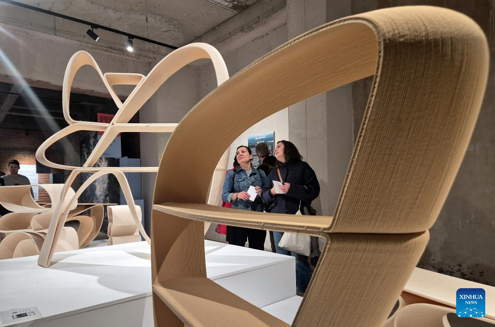 People visit the opening exhibition of Romanian Design Week (RDW) 2025 in Bucharest, Romania, May 16, 2025. The event, an annual festival dedicated to architecture, design and creativity, takes place from May 16 to 25 under the theme "Design of Tomorrow, Today." (Photo by Cristian Cristel/Xinhua)