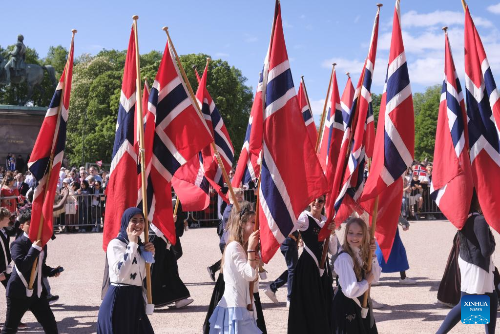 People parade to celebrate the Norwegian Constitution Day in Oslo, Norway, on May 17, 2025. (Photo by Chen Yaqin/Xinhua)