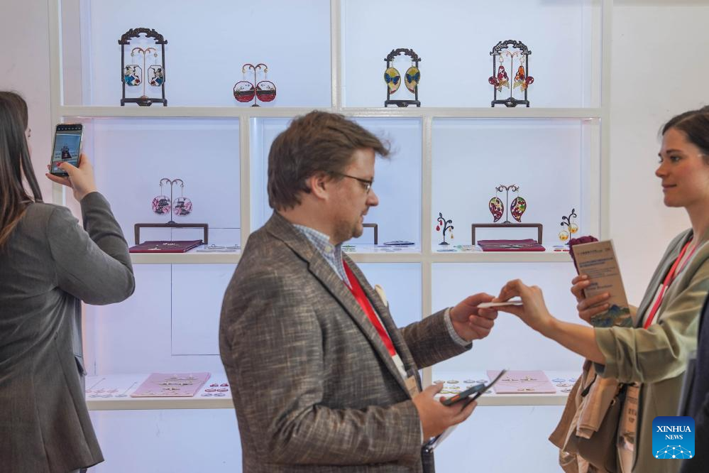 Visitors learn about Chinese cultural and creative products during the 2025 Budapest China Tourism and Culture Week in Budapest, Hungary, May 23, 2025. The 2025 Budapest China Tourism and Culture Week started on Friday in the Hungarian capital, aiming to facilitate exchanges and mutual learning between Chinese and other civilizations through cooperation platforms built for cultural and tourism industry insiders.