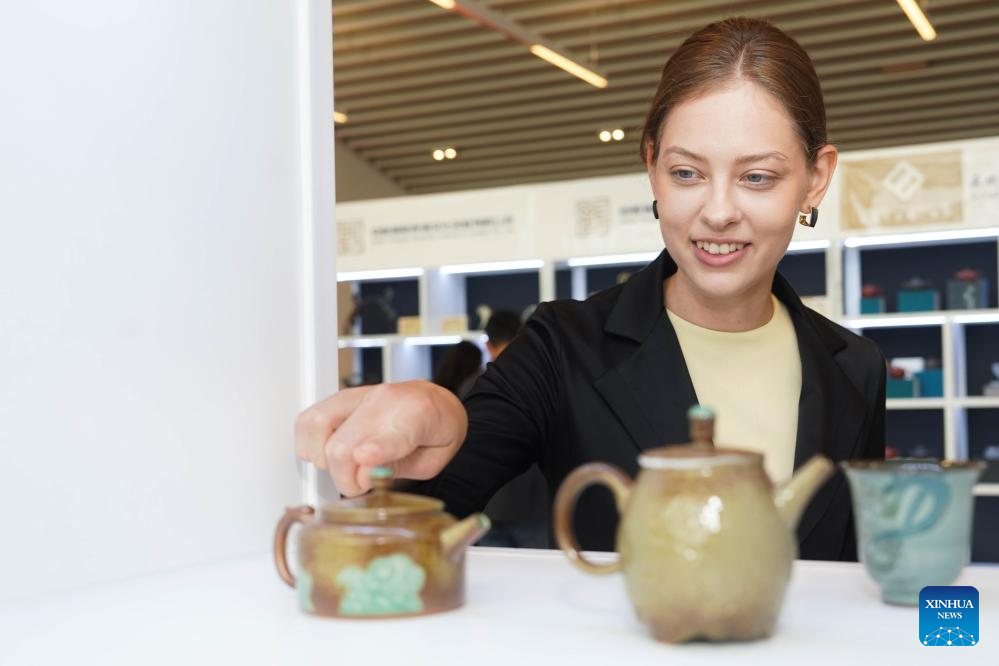 A visitor touches an exhibit during the 2025 Budapest China Tourism and Culture Week in Budapest, Hungary, May 23, 2025. The 2025 Budapest China Tourism and Culture Week started on Friday in the Hungarian capital, aiming to facilitate exchanges and mutual learning between Chinese and other civilizations through cooperation platforms built for cultural and tourism industry insiders.
