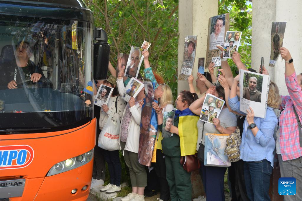 The released Ukrainians return to Ukraine by bus, May 23, 2025. Ukrainian President Volodymyr Zelensky on Friday announced that 390 Ukrainians returned home from captivity during the first stage of prisoner exchange with Russia under the "1,000 for 1,000 formula". Ukraine and Russia reached a deal on the largest swap of their captives during a meeting in Türkiye's Istanbul on May 16. (Photo by Peter Druk/Xinhua)