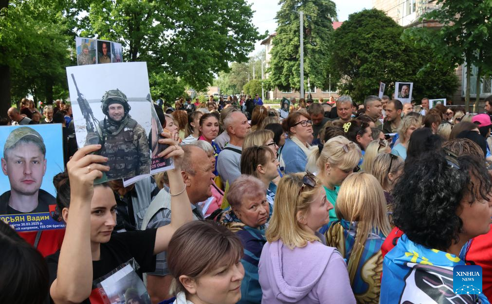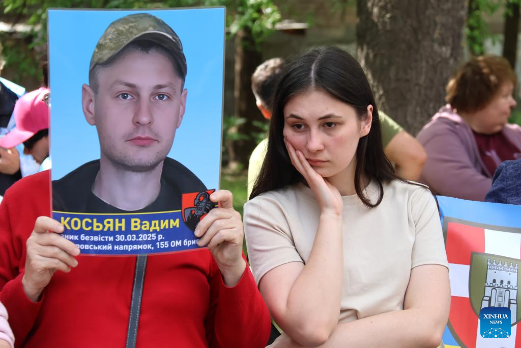 Ukrainian people hold photos of missing soldiers for help, May 23, 2025. Ukrainian President Volodymyr Zelensky on Friday announced that 390 Ukrainians returned home from captivity during the first stage of prisoner exchange with Russia under the "1,000 for 1,000 formula".