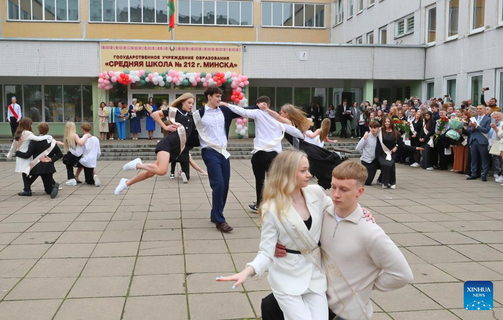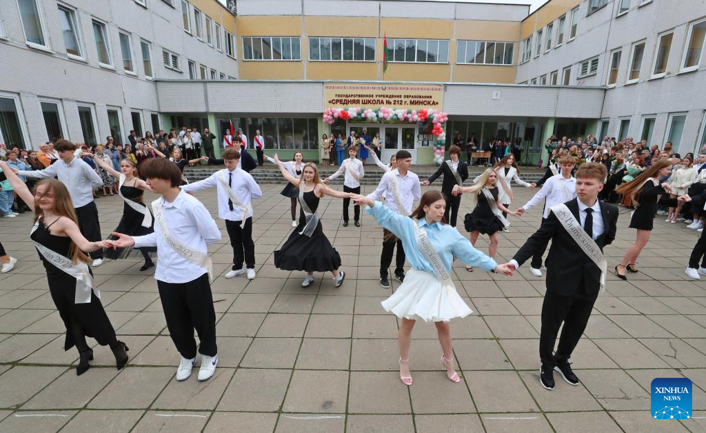 Graduates attend a graduation ceremony at a middle school in Minsk, Belarus, May 24, 2025. Some schools here held ceremonies to see off their graduates with flowers, waltz and ringing bells on Saturday. (Photo by Henadz Zhinkov/Xinhua)
