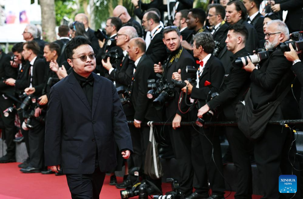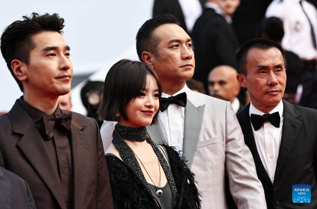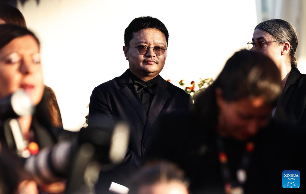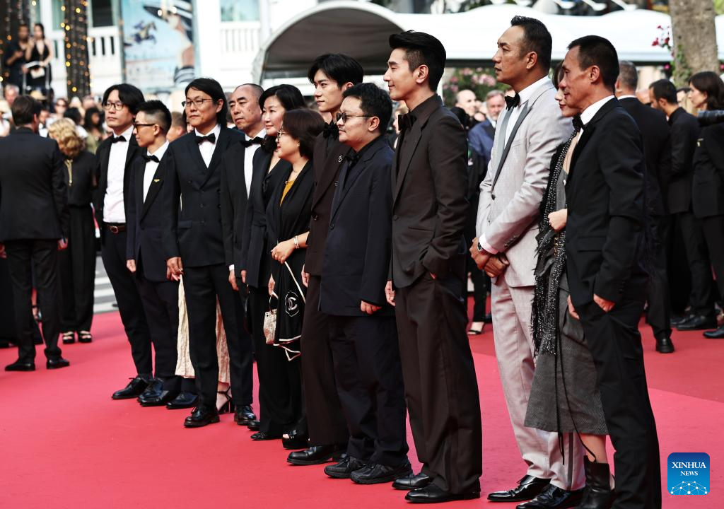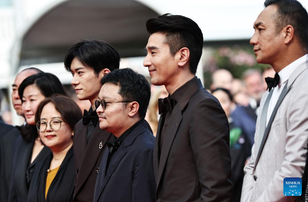 Chinese director Bi Gan (2nd L) and cast members of the Chinese film Resurrection pose upon their arrival at the red carpet of the closing ceremony of the 78th Cannes Film Festival in Cannes, France, May 24, 2025. Chinese director Bi Gan won on Saturday the Special Award at the 78th Cannes Film Festival for his epic fiction feature Resurrection, known in Chinese as Kuang Ye Shi Dai. Festival organizers introduced Resurrection as a work that showcases the continued evolution of Bi's creativity, while staying true to the sensory and poetic qualities that define his unique cinematic style. (Xinhua/Gao Jing)