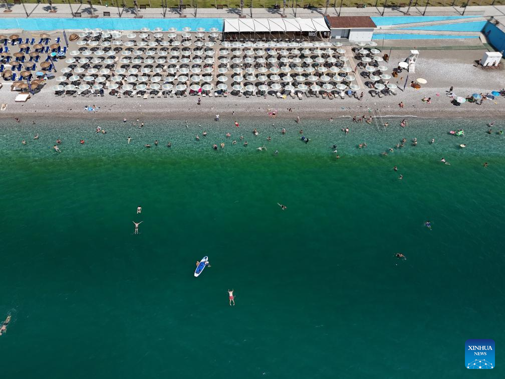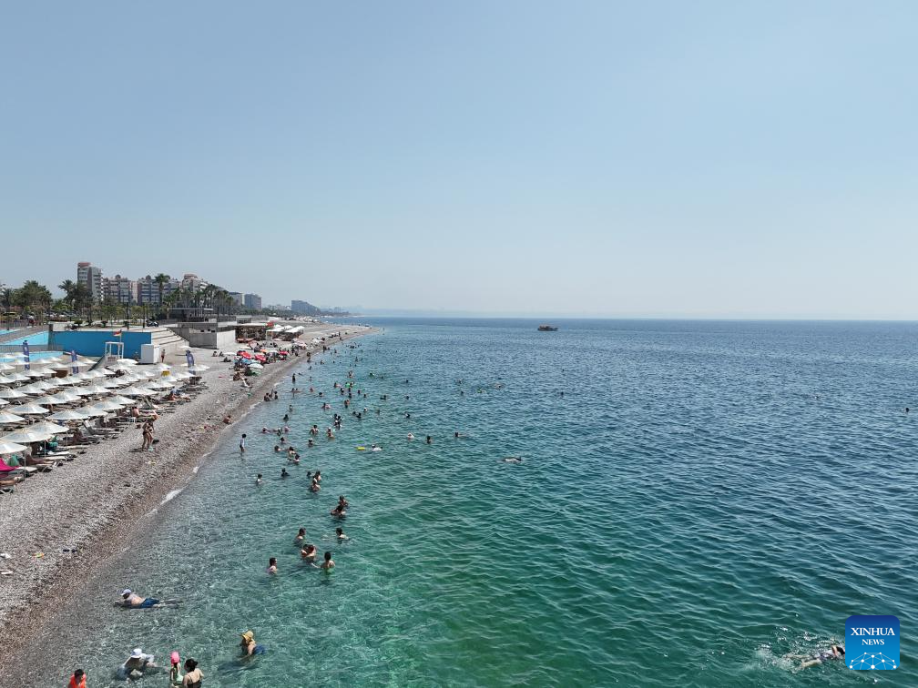 An aerial drone photo taken on May 25, 2025 shows people enjoying leisure time on the beach of Konyaalti in Antalya, Türkiye. (Mustafa Kaya/Handout via Xinhua)