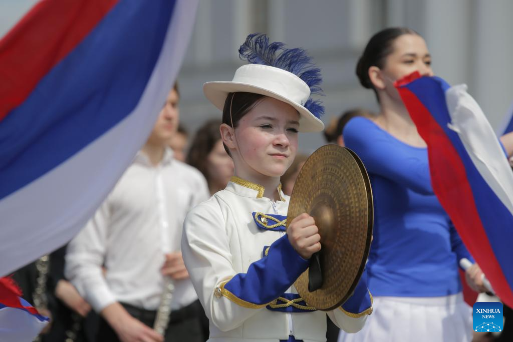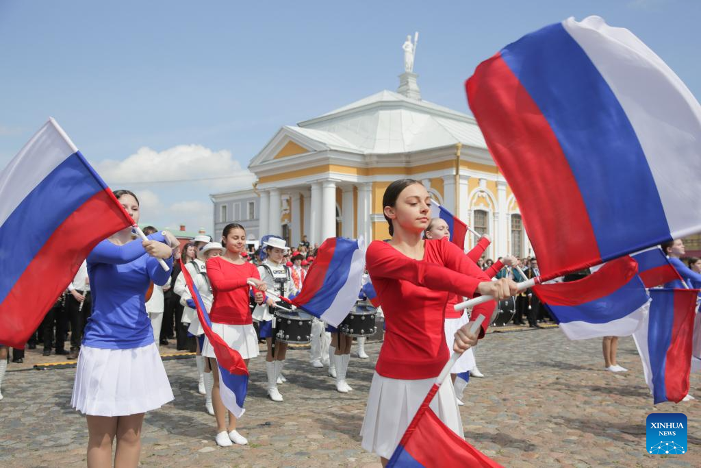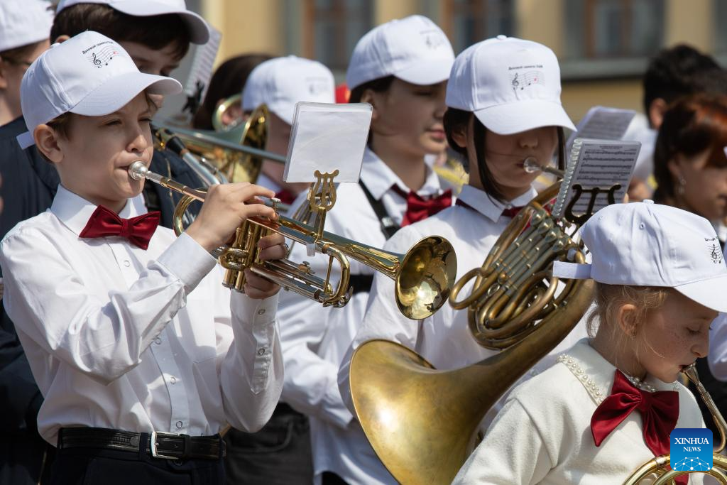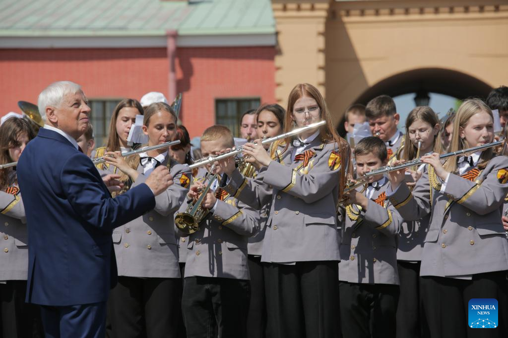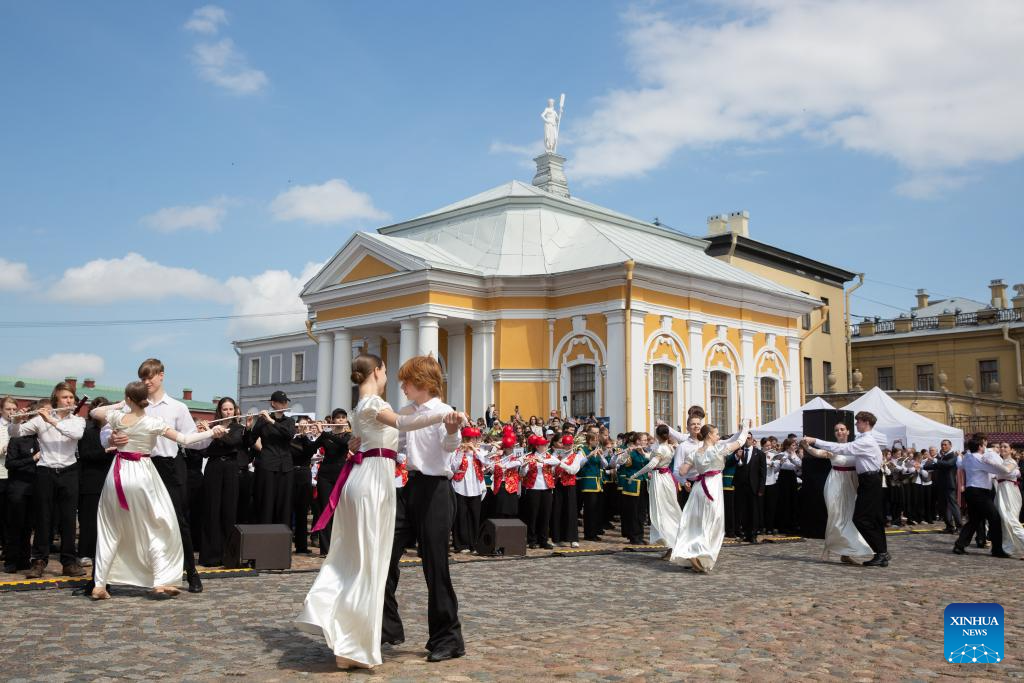Young musicians take part in a wind band performance in St. Petersburg, Russia, May 27, 2025. A grand wind band performance was held here on Tuesday to celebrate the 322nd anniversary of the founding of St. Petersburg. (Photo by Irina Motina/Xinhua)