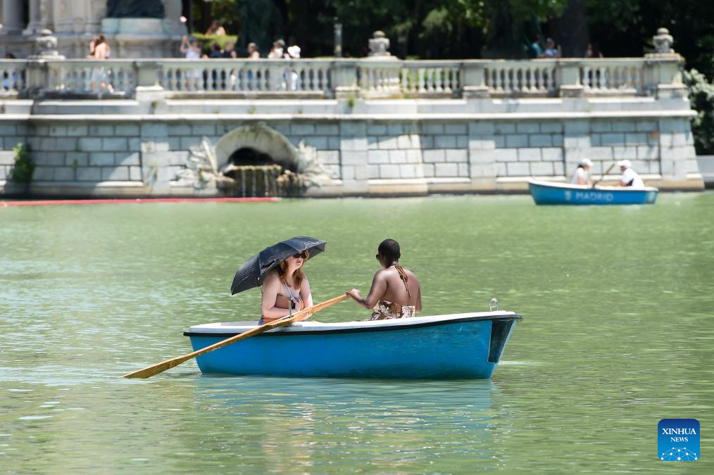 People row a boat to cool off on a river during a heat wave in Madrid, Spain, May 29, 2025. (Photo by Gustavo Valiente/Xinhua)