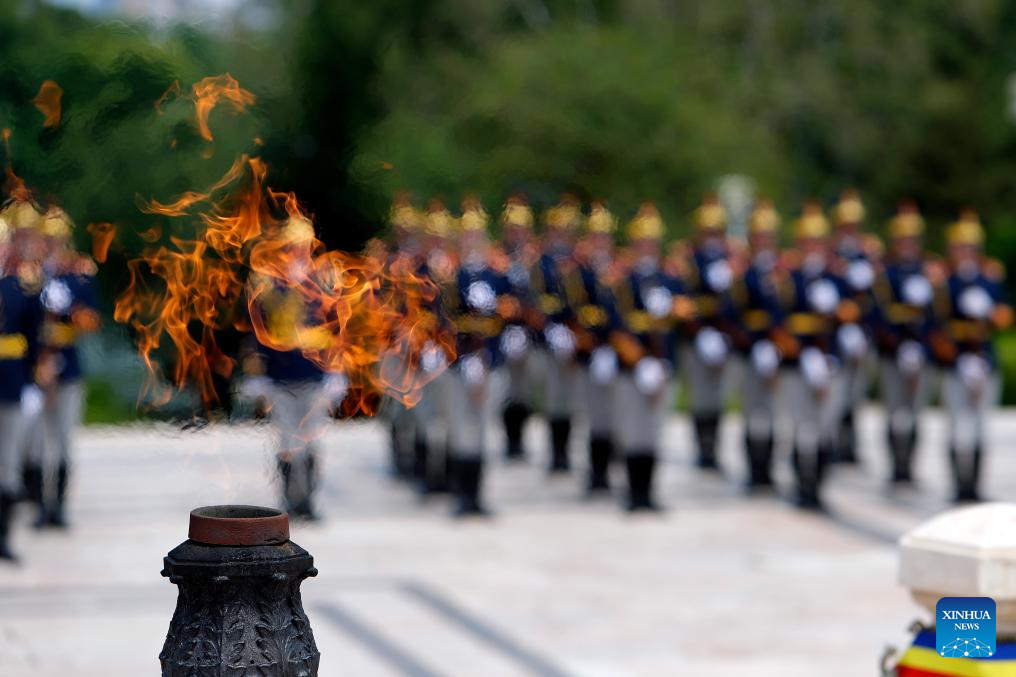 Romanian soldiers attend a ceremony marking the Heroes' Day at the Tomb of Unknown Soldier in Bucharest, Romania, on May 29, 2025. (Photo by Cristian Cristel/Xinhua)