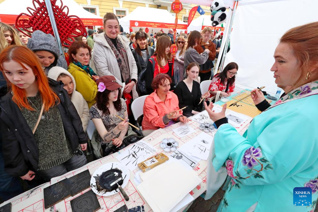 People try traditional Chinese painting during a cultural event "Tea for Harmony: Yaji Cultural Salon" held in Minsk, Belarus, May 31, 2025. (Photo by Henadz Zhinkov/Xinhua)