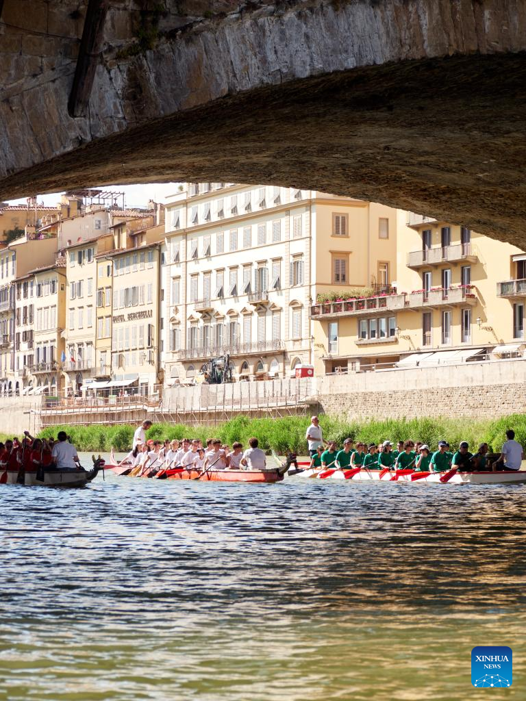 FLORENCE, Italy, June 2 (Xinhua) -- Against the backdrop of Florence's Renaissance skyline, the rhythmic beat of drums from three dragon boats racing in the Arno River drew crowds along the banks, marking a vibrant celebration of the traditional Chinese Dragon Boat Festival.