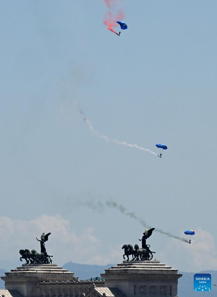 Parachutists perform during the Republic Day celebrations in Rome, Italy, June 2, 2025. Italy on Monday marked the 79th anniversary of its founding as a republic, with President Sergio Mattarella calling for peace and international cooperation. (Photo by Alberto Lingria/Xinhua)