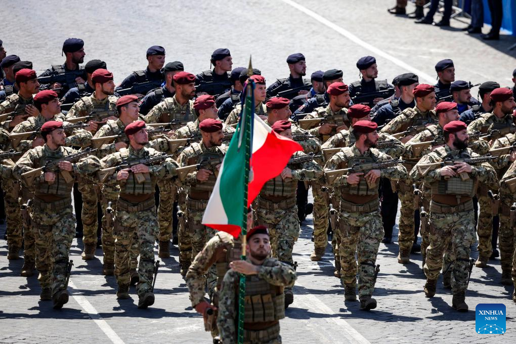 Soldiers parade during the Republic Day celebrations in Rome, Italy, June 2, 2025. Italy on Monday marked the 79th anniversary of its founding as a republic, with President Sergio Mattarella calling for peace and international cooperation. (Photo by Alberto Lingria/Xinhua)