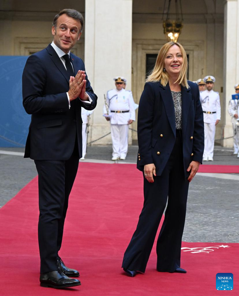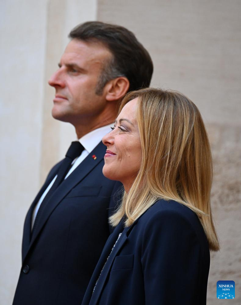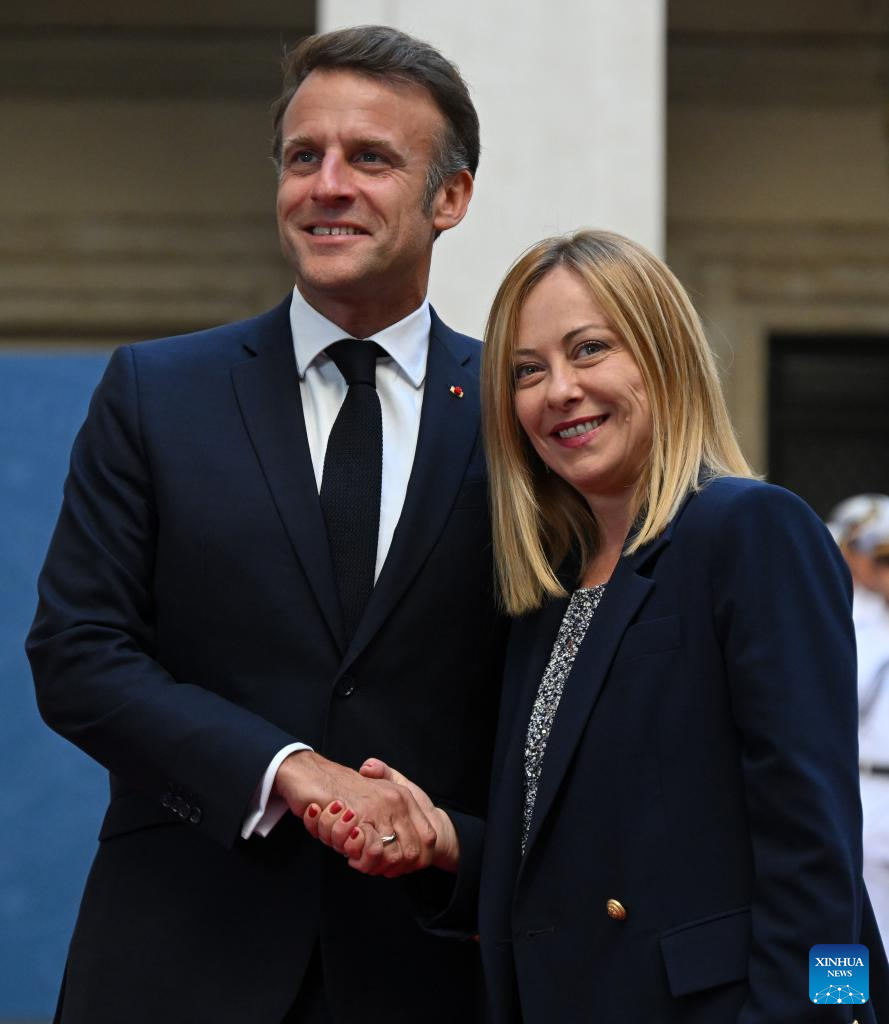 ROME, June 3 (Xinhua) -- Italy's Prime Minister Giorgia Meloni on Tuesday welcomed French President Emmanuel Macron and the two leaders held bilateral talks on various issues, including trade, and relationships with the United States, according to Italian media.