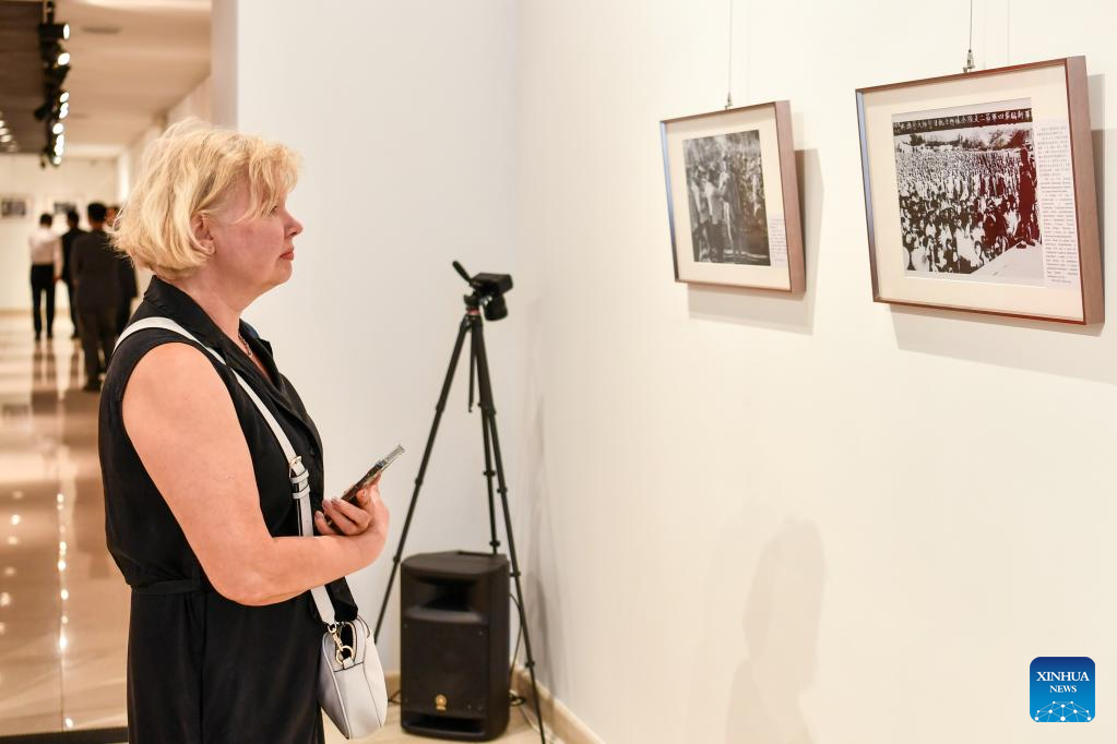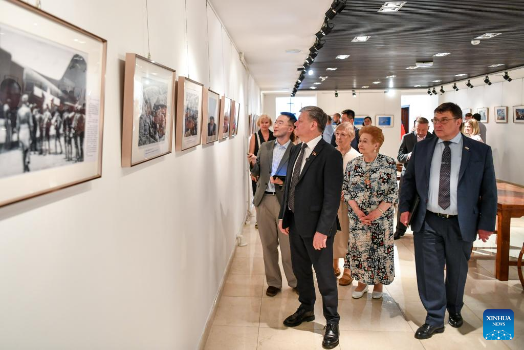 The exhibition, titled "Shoulder to Shoulder for Shared Victory," featured dozens of old photos from the archives of Xinhua News Agency, which captured key wartime events, the heroic struggles of the Chinese people, and the joint contribution of China and Russia to defeating fascism and militarism, as well as contemporary photos illustrating recent China-Russia military and cultural cooperation.